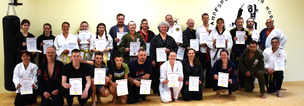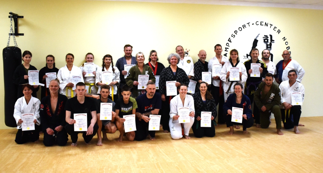 Am vergangenen Samstag fand im KSC Nobbe ein weiter weiter Lehrgang für Budo interessierte statt. Dieses Mal mit den Schwerpunkten Stock und Messer Abwehr sowie Fallschule. Großmeister Ralf Kniephoff 7. Dan sowie Anatoli Münz 2.Dan, zeigen einige Varianten und Möglichkeiten wie man sich, in bestimmten Situationen, Verhalten könnte. Die Rund 30 Teilnehmerinnen und Teilnehmer hatten sichtlich viel Spaß. Hier nun einige Eindrücke des dreistündigen Seminars.